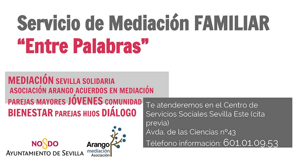 Nuestra Asociación Arango Mediación comienza en estos días el bonito proyecto “Entre Palabras”. El proyecto que se desarrolla en el marco de la convocatoria del Ayuntamiento “Sevilla Solidaria 2014” nace con el convencimiento de que hay que llenar nuestros barrios de mediación, diálogo y entendimiento. El punto de mediación familiar estará dirigido a todas aquellas personas, vecinos y vecinas de Alcosa y Sevilla-Este que estén pasando una situación difícil en el seno de sus familias. Así, se podrán abarcar conflictos de pareja en situaciones divorcio, separaciones, tiempo compartido con los hijos/as, conflictos intergeneracionales, herencias, escenarios difíciles por la complicada situación de dependencia que sufren los mayores, etc… El punto de mediación familiar estará abierto un día a la semana en el Centro de Servicios Sociales de Sevilla Este y comenzará a funcionar en el mes de abril hasta final de año.